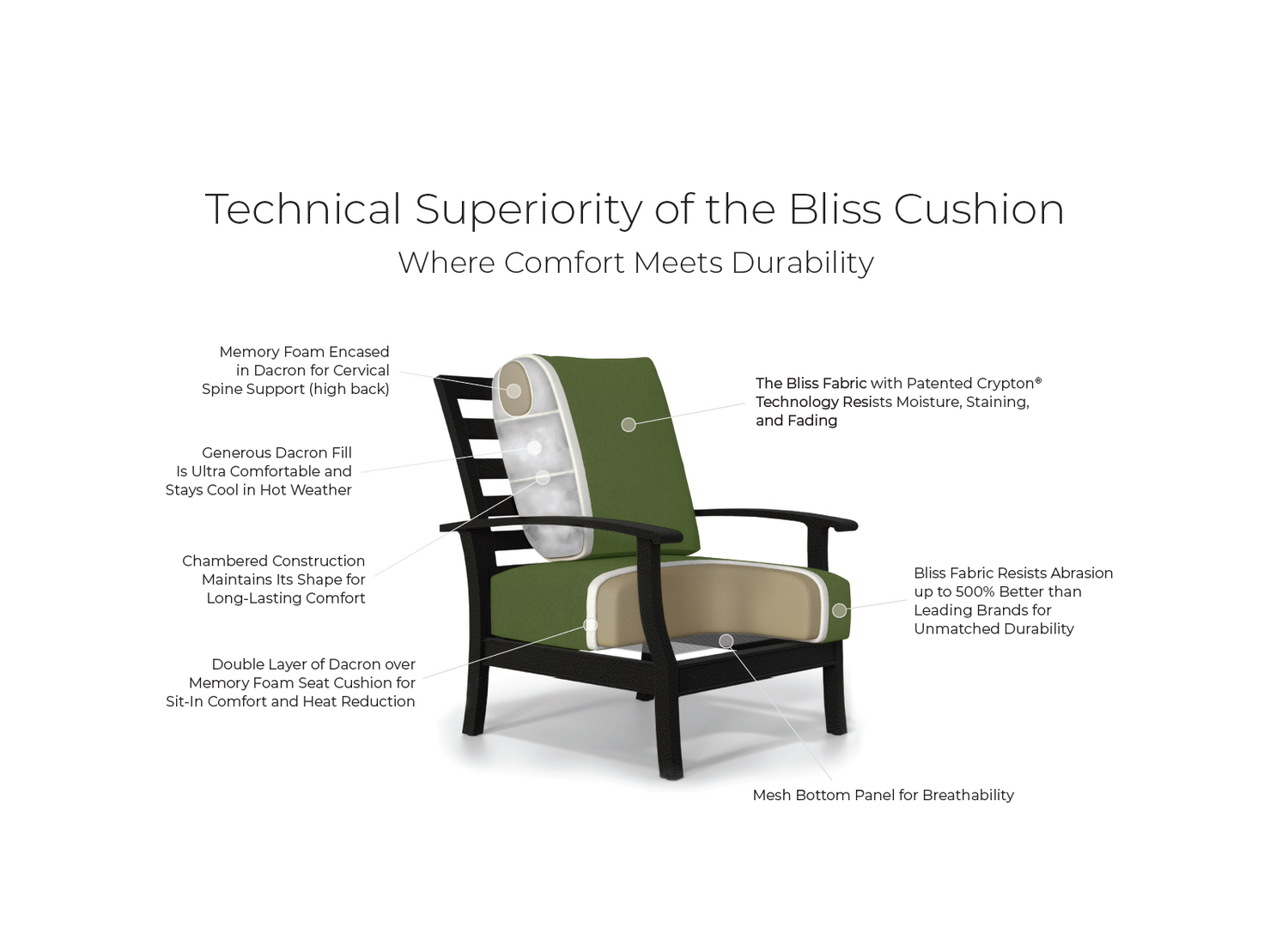 The Bliss Cushion uses patented GREENGUARD Certified Crypton®stain & moisture protection integrated into the fabric for superior performance. Compare this to temporary topical nano-coating treatments found on other outdoor cushions that lose their effectiveness over time.