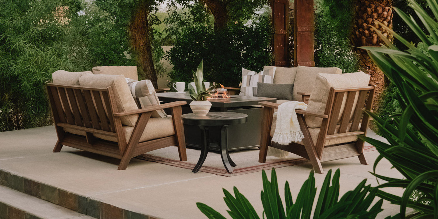 Sloped arms and woven rope accents bring effortless comfort to outdoor spaces.