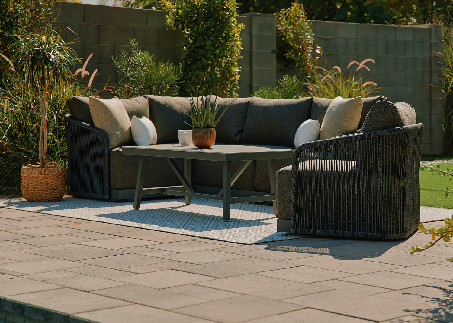 Sloped arms and woven rope accents bring effortless comfort to outdoor spaces.